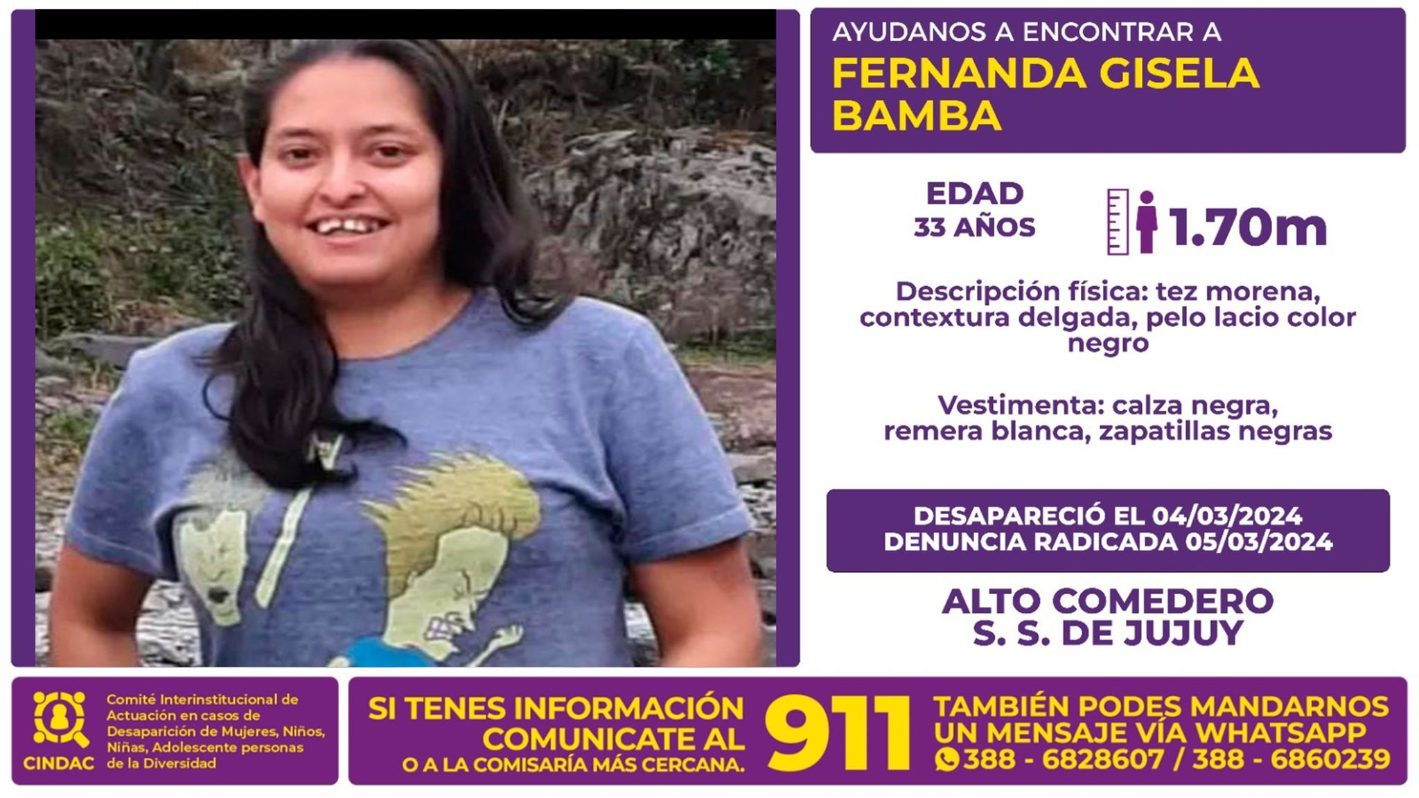 FERNANDA GISELA BAMBA es de contextura delgada, tez morena, 1,70 mts. de estatura, cabello liso largo color negro. Vestía calza de color negro, remera corta de color blanco y zapatillas deportivas color negro.