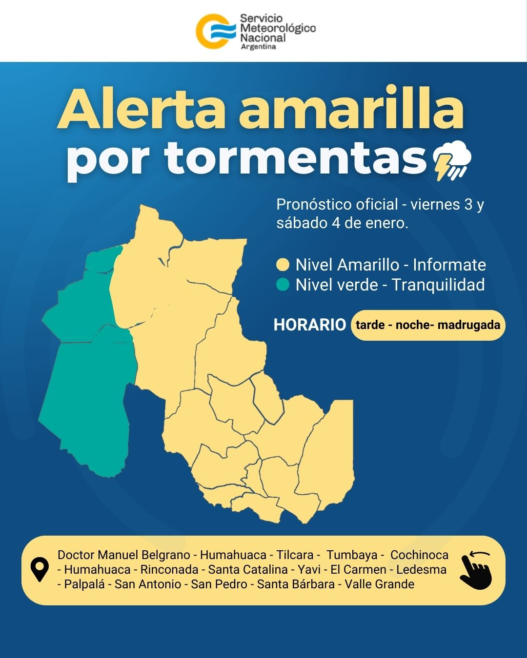 El Servicio Meteorológico Nacional (SMN) emitió una Alerta Amarilla para varias localidades del noroeste argentino debido a la llegada de tormentas intensas, que afectarán a la región durante este viernes y sábado.