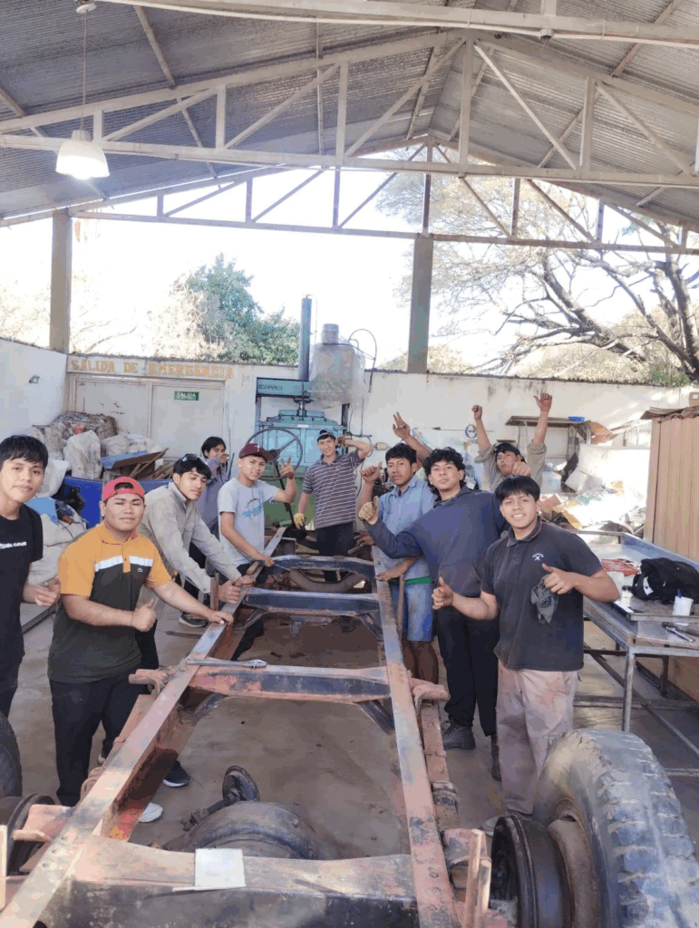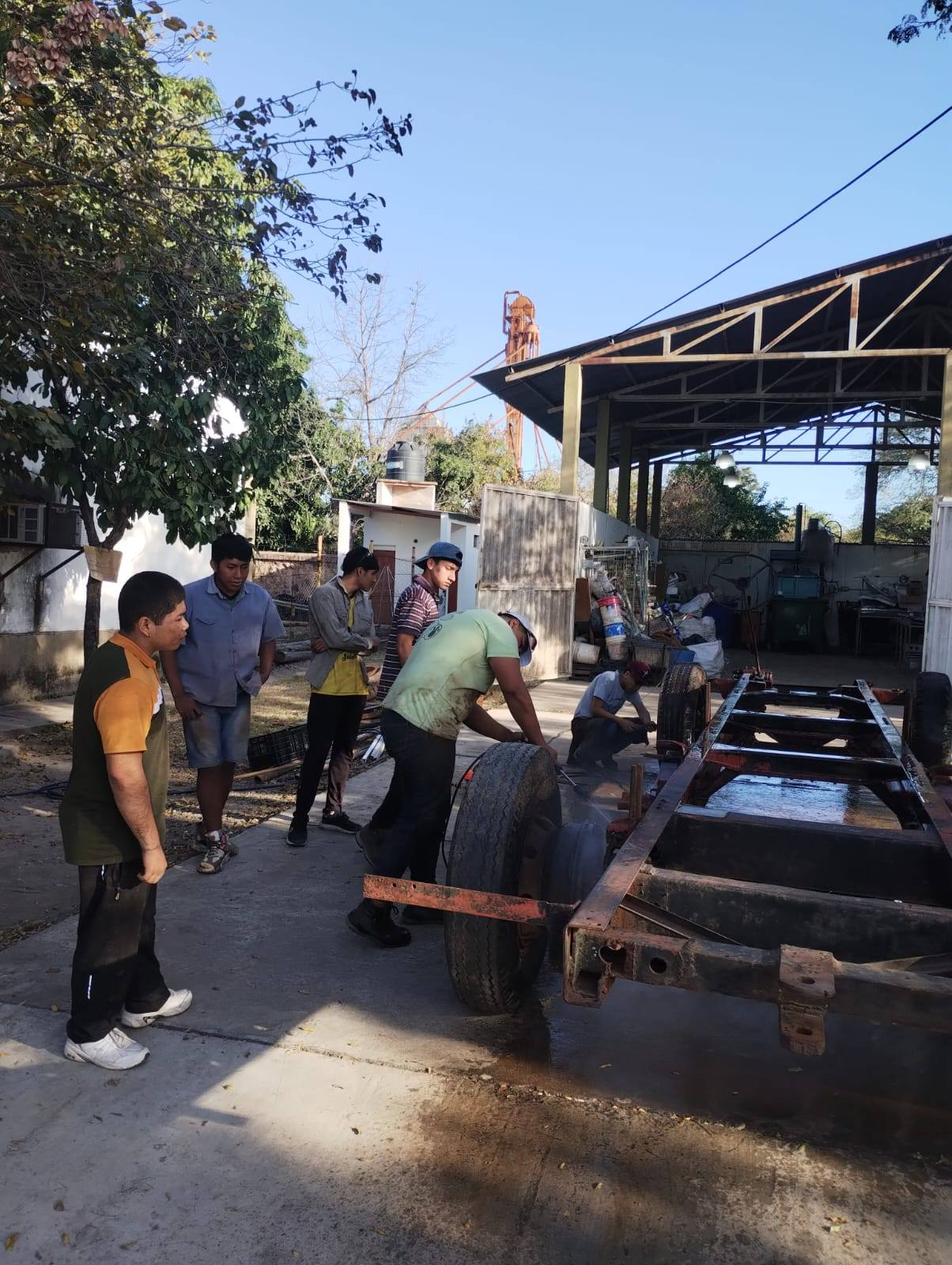 Los trabajos de construcción comenzaron en la planta de reciclado ubicada sobre avenida Hipólito Yrigoyen, espacio donde se instaló el canchón gracias a la gestión de la Municipalidad de San Pedro de Jujuy, que acompañó y facilitó las condiciones necesarias para que alumnos y docentes puedan llevar adelante esta propuesta.