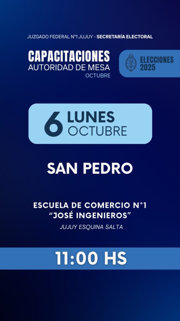 La Secretaría Electoral del Juzgado Federal N.º 1 de Jujuy informa que hoy lunes 6 de octubre se realizarán las capacitaciones correspondientes a las Elecciones 2025 en la localidad de San Pedro.