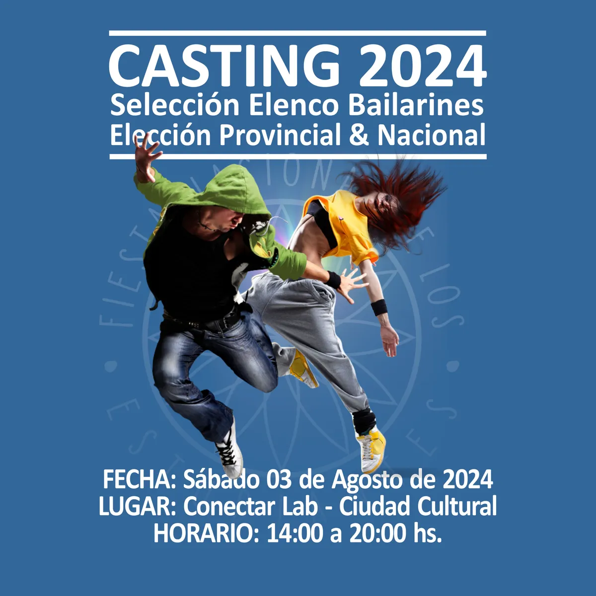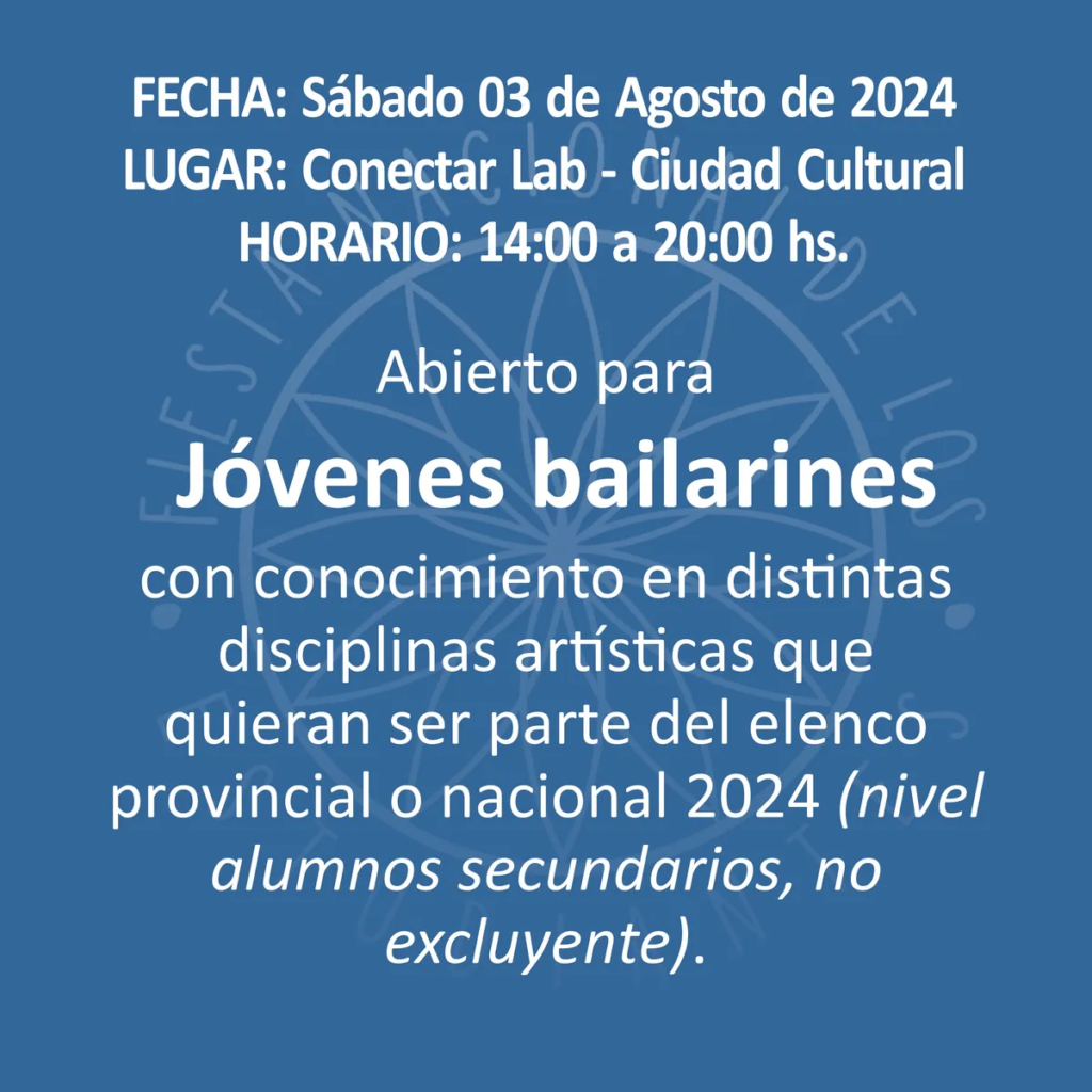 El Ente Autárquico Permanente de la FNE comunica que este 3 de Agosto en Conectar Lab (Ciudad Cultural) de 14 a 20 horas, se realizará el casting abierto a estudiantes del ciclo lectivo secundario (no excluyente) para ser del elenco de la elección de la Representante Provincial y Nacional a bailarines, cantantes y acróbatas.