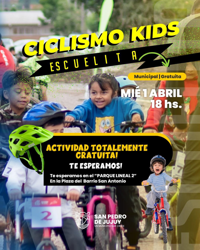 La Municipalidad de San Pedro de Jujuy invita a la comunidad a participar de “Ciclismo Kids – Escuelita”, una propuesta gratuita destinada a niñas y niños que deseen iniciarse en el mundo del ciclismo de manera segura y recreativa.