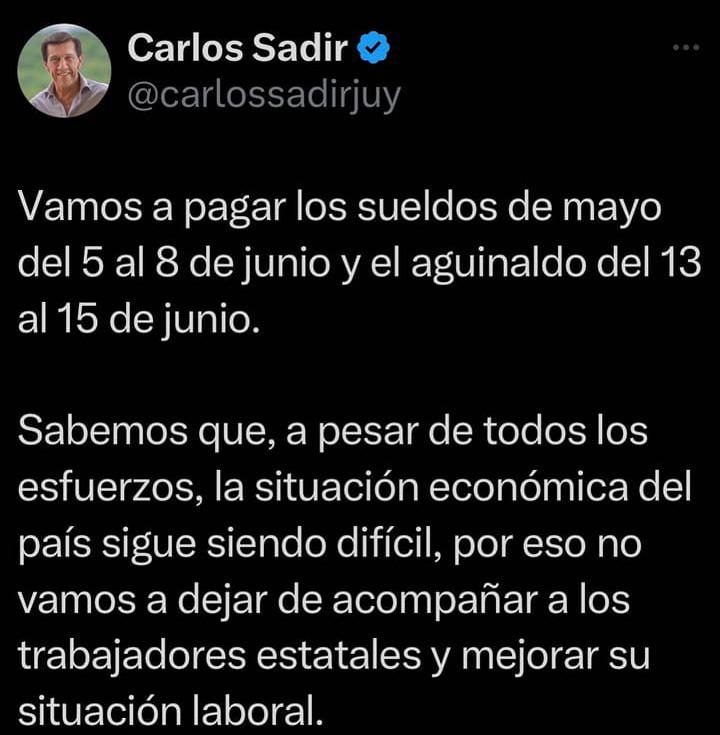 El gobernador de Jujuy, Carlos Sadir informó mediante redes sociales las fechas de cobro, tanto de los haberes correspondientes al mes de mayo como la fechas del aguinaldo.