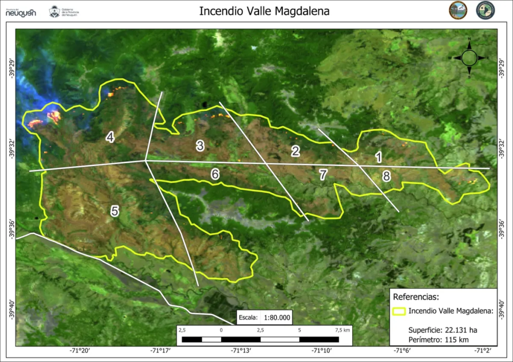 Cabe destacar que 255 combatientes de las distintas regionales, incluida la del NOA (Jujuy, Salta, Catamarca y Tucumán), del Servicio Nacional de Manejo del Fuego (SNMF) se despliegan todos los días en los ocho sectores identificados para combatir el incendio «Magdalena», que hasta el día de hoy no da tregua en el Parque Nacional Lanín.