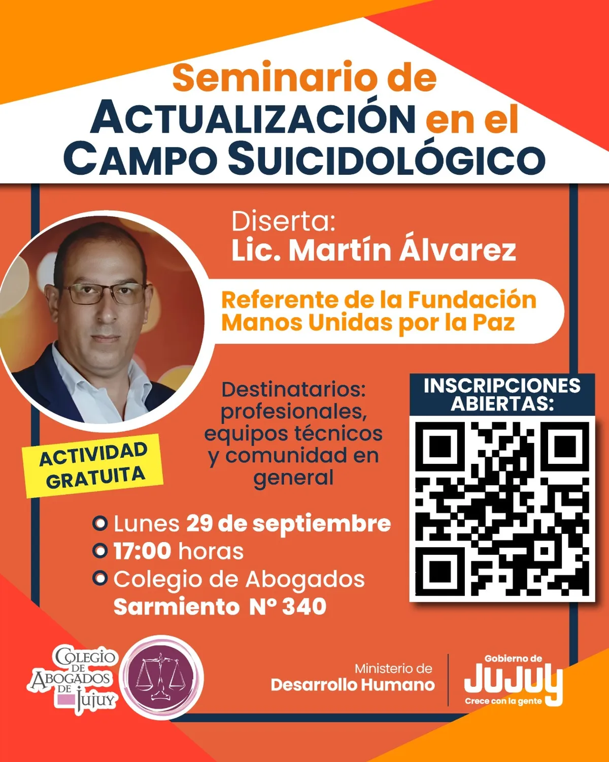 El Ministerio de Desarrollo Humano de Jujuy, a través de la Secretaría de Niñez, Adolescencia y Familia, realizará el 29 de septiembre el Seminario de Actualización en el Campo Suicidológico Ley Nacional Nº 27.130 y Ley Provincial Nº 5938, actividad gratuita destinada a profesionales, equipos técnicos y comunidad en general.
