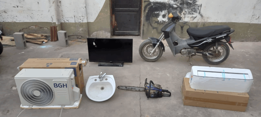 De intensas averiguaciones, el personal de la Brigada de Investigaciones pudo establecer que en diferentes domicilios de la ciudad habrían recepcionado los bienes sustraídos, logrando el recupero de: (1) máquina de soldar, (1) motosierra, (1) aire acondicionado, (1) televisor y (1) lavatorio. en cuanto al motovehículo, se constató que habría sido trasladado a la localidad de Perico, por lo que se trabajó en forma conjunta con los agentes de del Brigada de Perico, logrando el recupero del mismo.