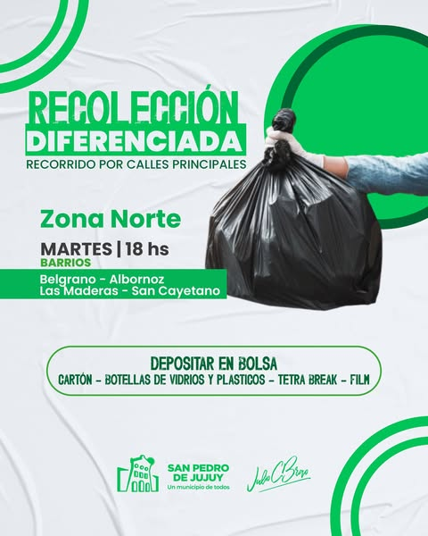 La Municipalidad de San Pedro de Jujuy informa a la comunidad que a partir de esta semana se implementará el servicio de recolección diferenciada de residuos en distintos barrios de la zona norte de la ciudad, con el objetivo de fortalecer las políticas ambientales y promover una ciudad más limpia y sustentable.