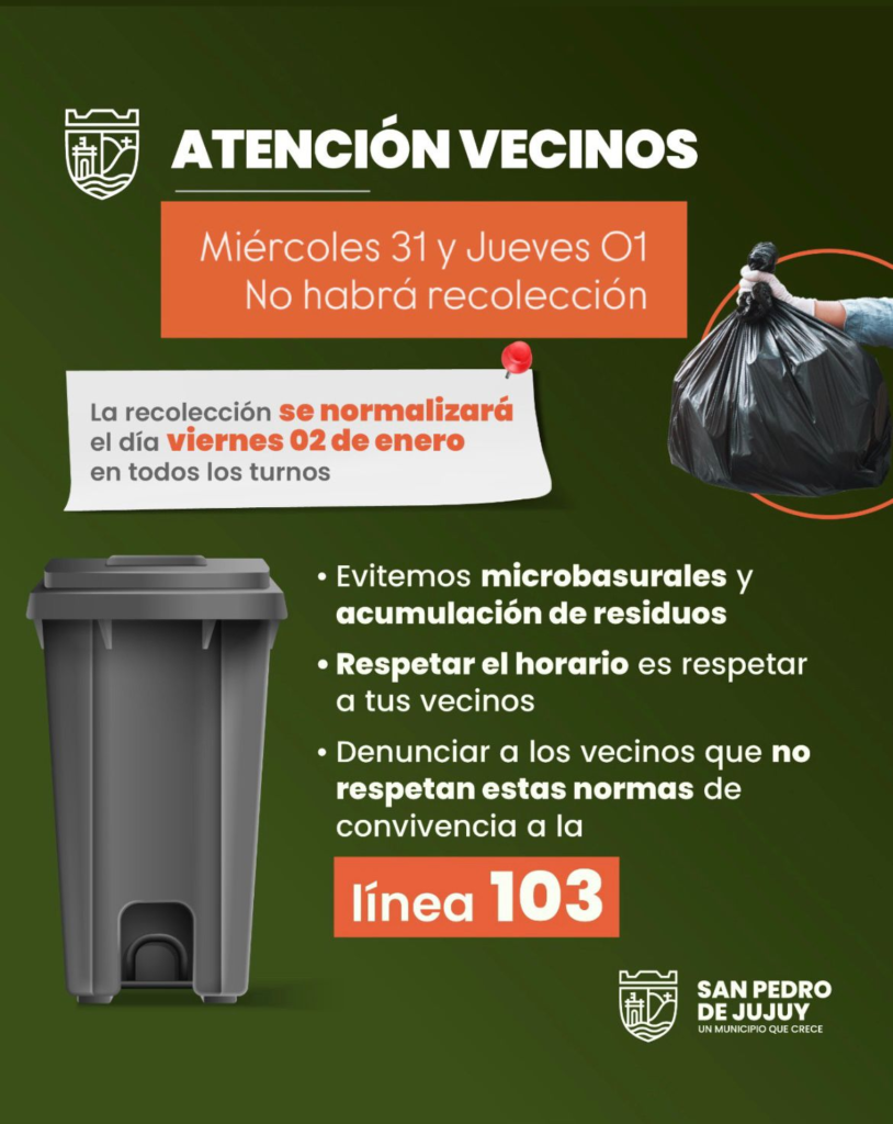 La Municipalidad de San Pedro de Jujuy informa que no habrá servicio de recolección de residuos los días miércoles 31 y jueves 01 de enero, por lo que se solicita a los vecinos no sacar la basura durante esas jornadas.