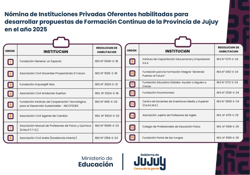 El Ministerio de Educación de la Provincia de Jujuy, a través de la Unidad de Formación Continua de Instituciones Oferentes dependiente de la Secretaría de Planeamiento Estratégico, informa a la comunidad educativa la nómina actualizada de las Instituciones Privadas habilitadas para ofrecer propuestas de Formación Continua en el año 2025.