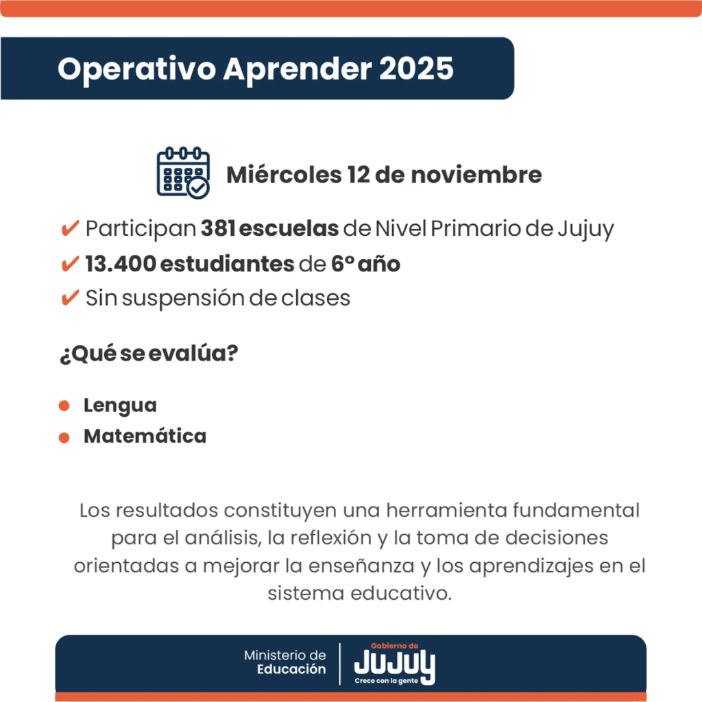 El Ministerio de Educación de la Provincia informa que este miércoles 12 de noviembre se llevará a cabo en todo el país el Operativo Nacional de Evaluación Aprender 2025, destinado a estudiantes de 6° año del Nivel Primario, sin suspensión de clases.