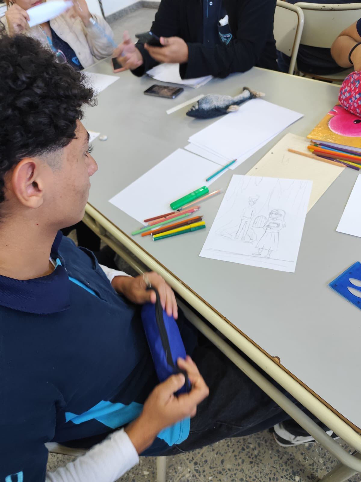 La profesora Belén Cabello estuvo a cargo del taller, guiando a los alumnos en la creación de cuentos originales que reflejan sus ideas, emociones y mundos imaginarios. Cada historia fue acompañada por ilustraciones realizadas en vivo por el profesor Cristian Lino, sumando color y forma a las palabras.