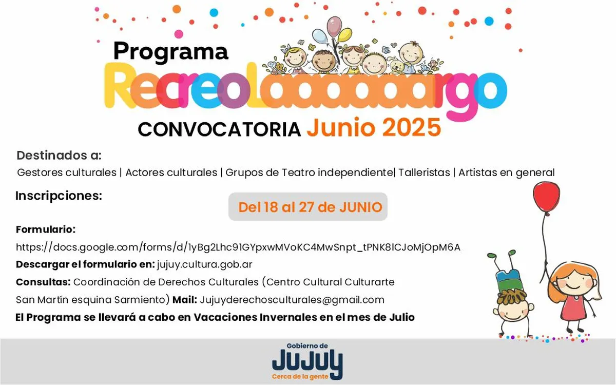 La propuesta está destinada a artistas y trabajadores de la cultura para participar del programa “Recreo Largo», que se realizará durante las vacaciones de invierno en Jujuy.