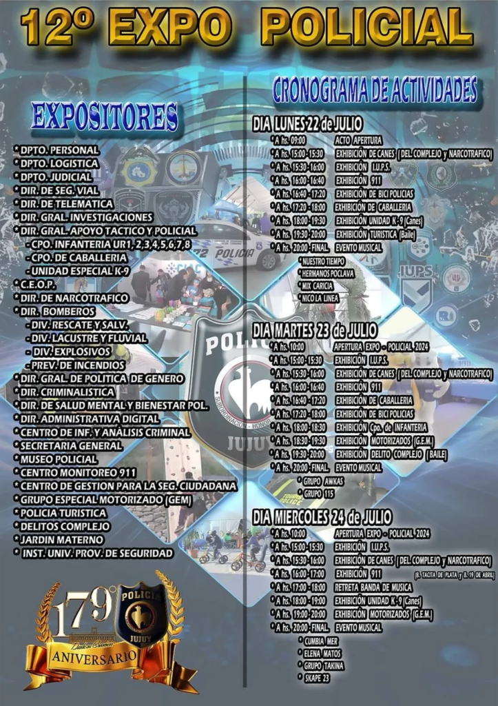En el marco del 179° Aniversario de la Policía de Jujuy, se dio inicio a la Expo Policial 2024, la cual se desarrollará a lo largo de los días 22, 23 y 24 de julio de 9:00 a 21:00 hs. con entrada libre y gratuita.
