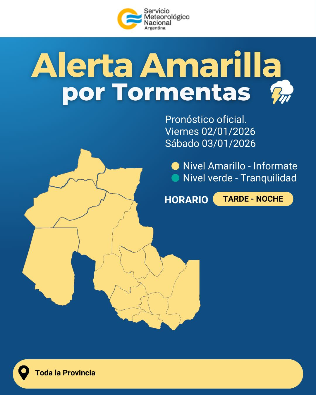 El Servicio Meteorológico Nacional emitió una Alerta Amarilla por tormentas para toda la provincia de Jujuy, vigente durante la tarde y noche del viernes 2 de enero y del sábado 3 de enero.