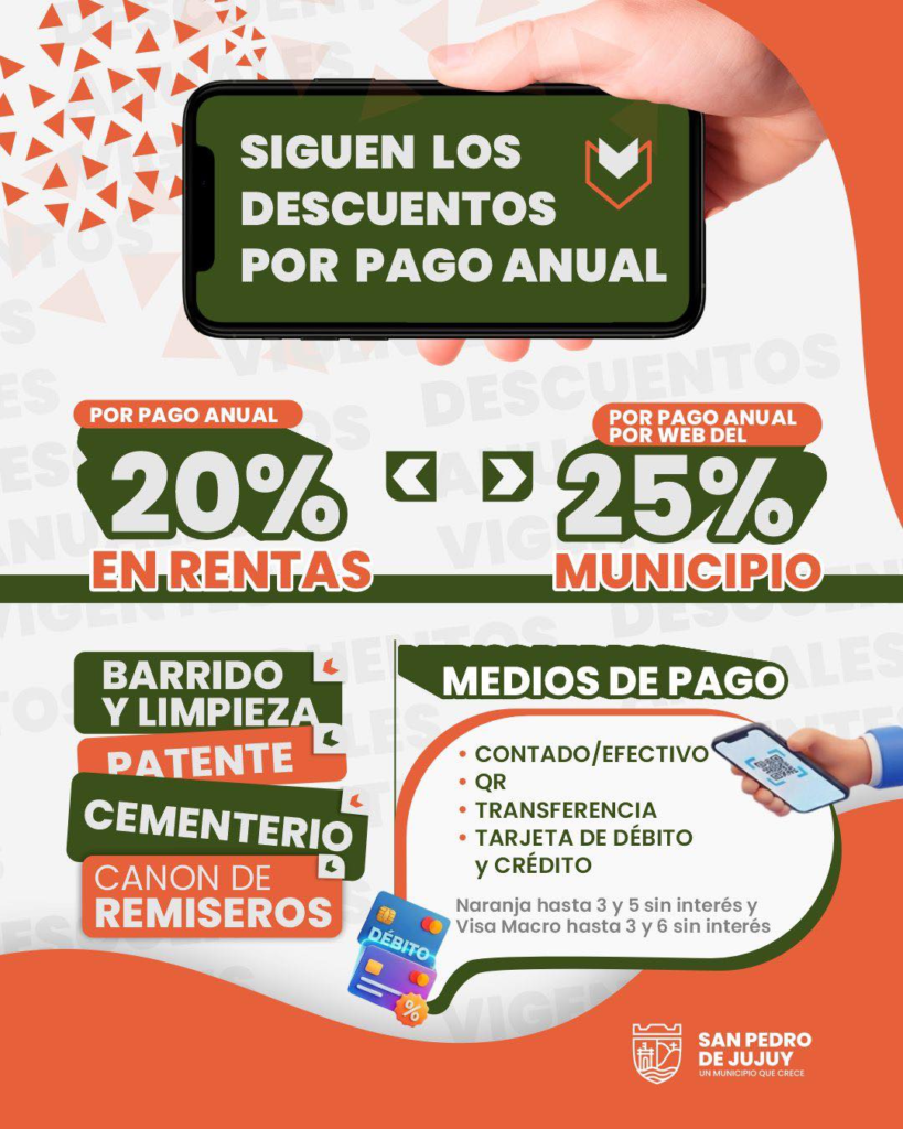 La Municipalidad de San Pedro de Jujuy informó que continúan vigentes los descuentos para quienes opten por el pago anual de sus tributos, una medida que busca acompañar a los contribuyentes y facilitar el cumplimiento de sus obligaciones.