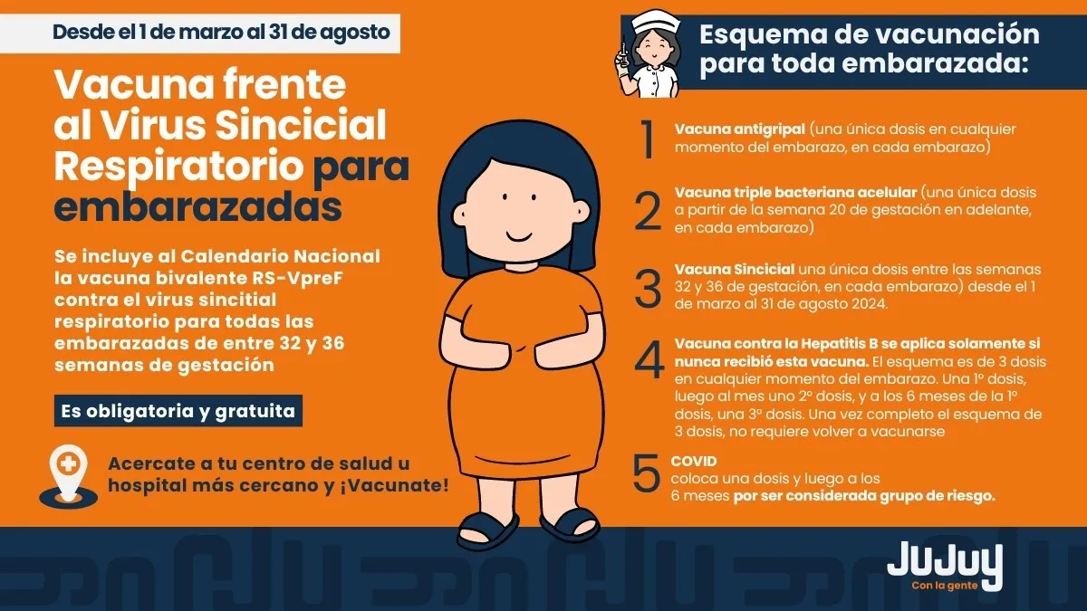 El Ministerio de Salud de Jujuy recordó a la comunidad que hasta el próximo sábado 31 de agosto se lleva adelante la campaña de vacunación exclusiva para embarazadas frente al Virus Sincicial Respiratorio (VSR).